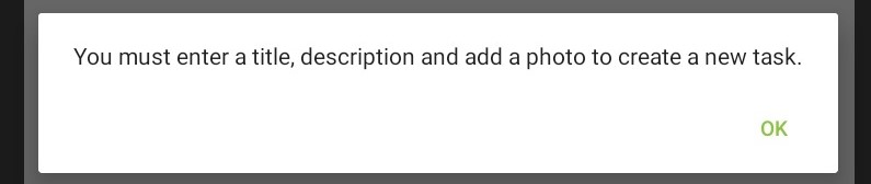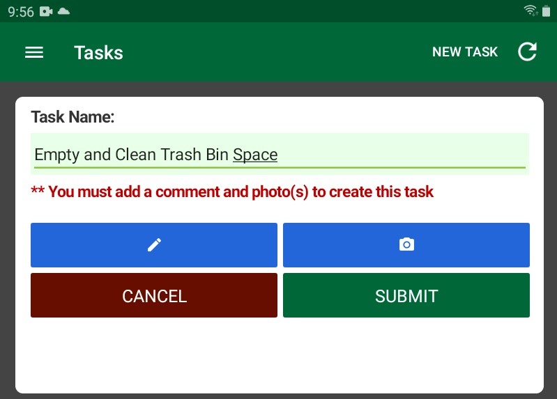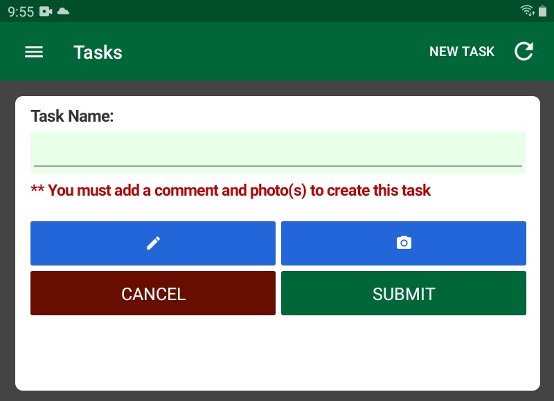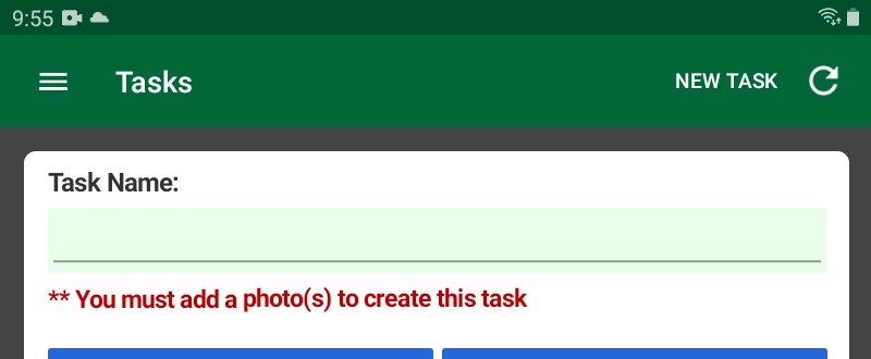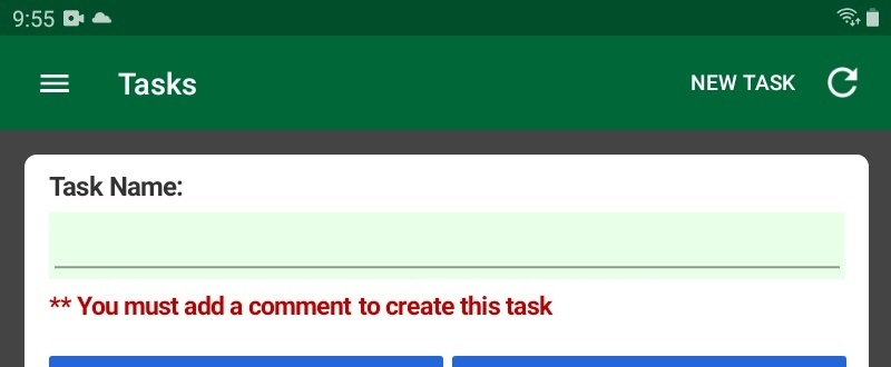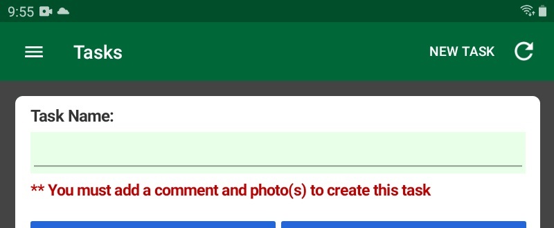 - If you must add comments, photos, or both to the task in order to create it, the appropriate message appears below the Task Name field. You will not be able to create the task until you have added all required items.