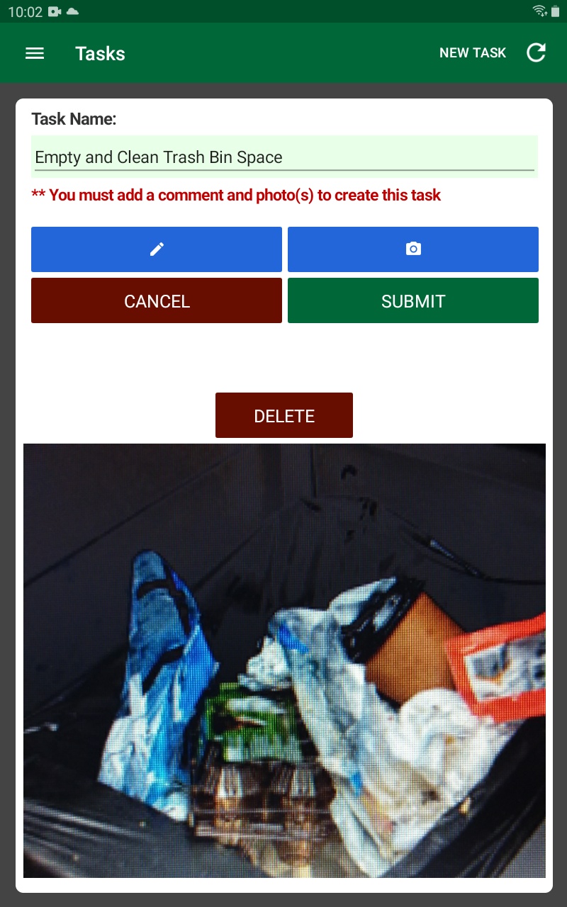 - To remove a photo from the task, locate the photo and tap DELETE. The photo is removed from the task.